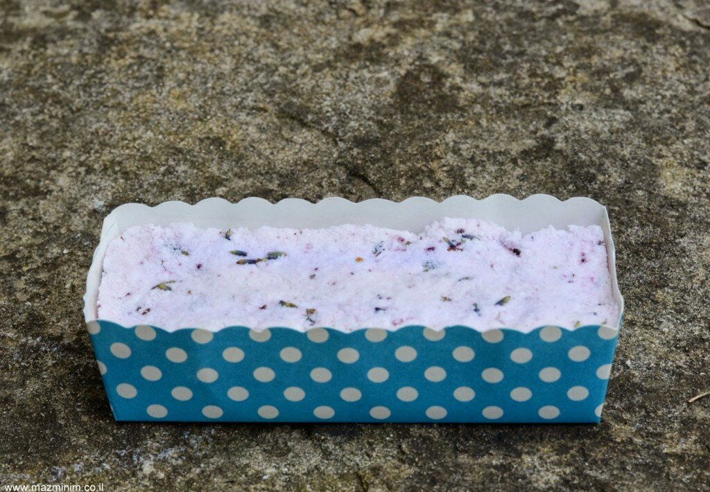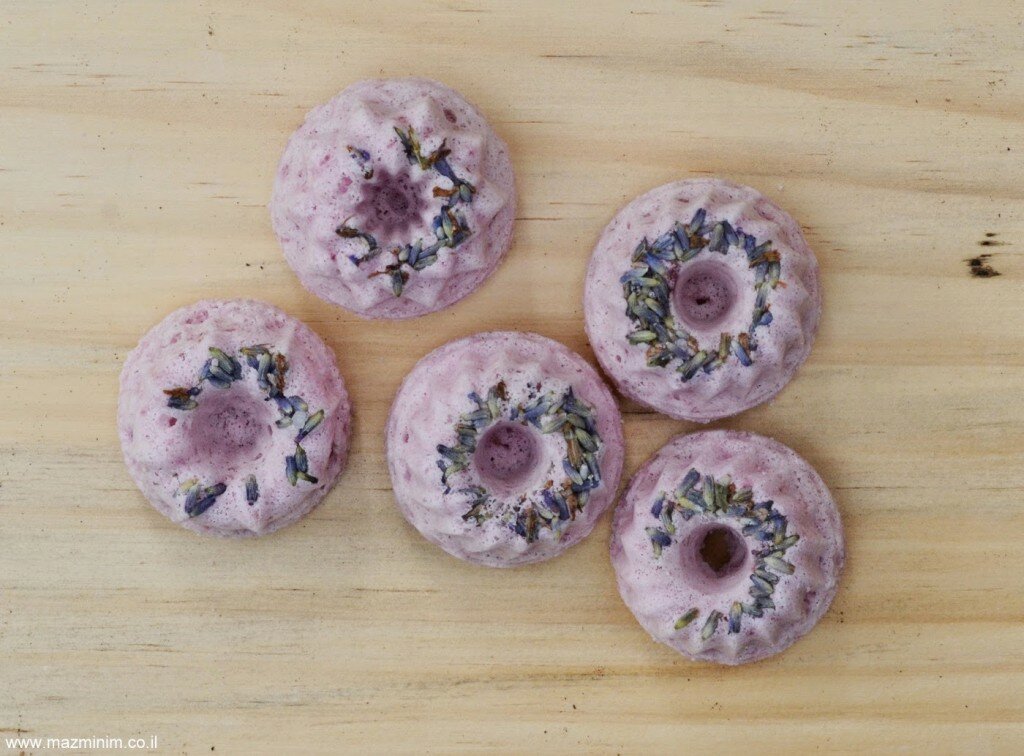 מלבד הפצצות המלבניות השתמשנו בתבנית הסיליקון השימושית בעזרתה הכנתי את חנוכיית הפטיפורים וגם את הטראפלס שוקולד תפוז. פיזרנו מעט פרחי לבנדר בתחתית התבנית ומילאנו בתערובת.