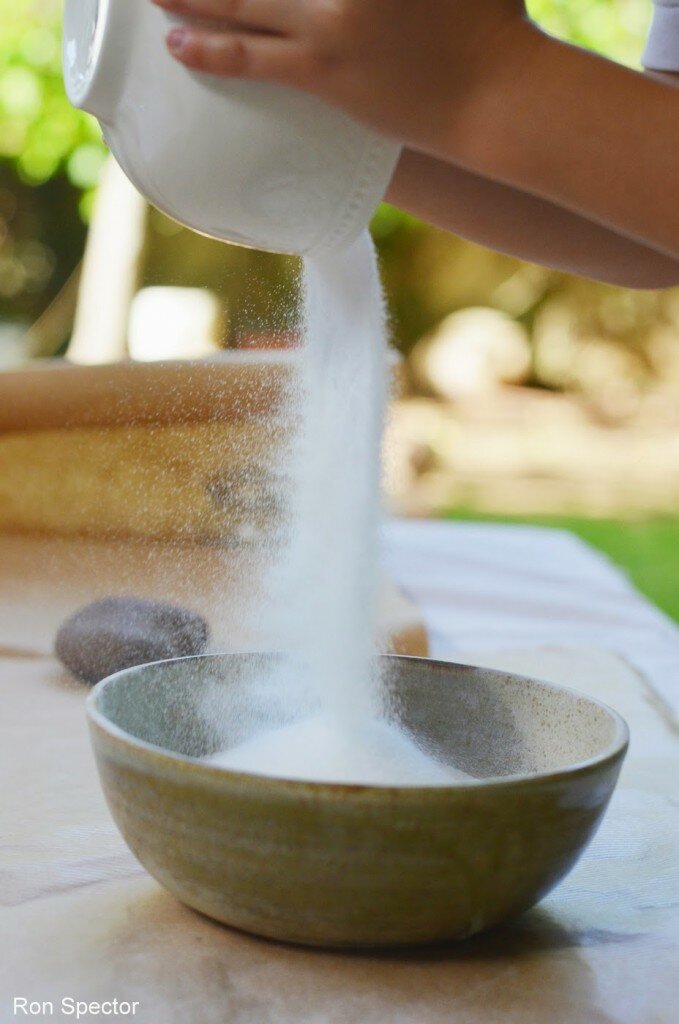 מודדים 300 גרם מלח לימון ומעבירים אותו דרך המסננת אל תוך הקערה בכדי לפורר את הגושים הקטנים האופיניים.
