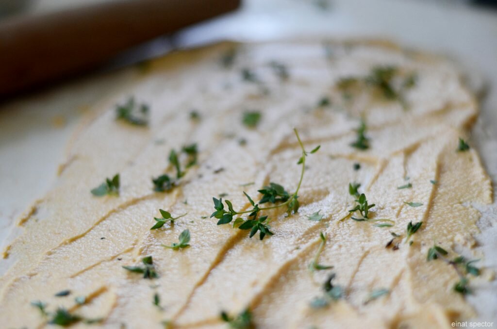 ♢ נוטלים מחצית מהבצק ומרדדים למלבן בגודל של כ 20 על 40 ס"מ. מורחים את הקרם על הבצק. מפוררים עלי טימין.