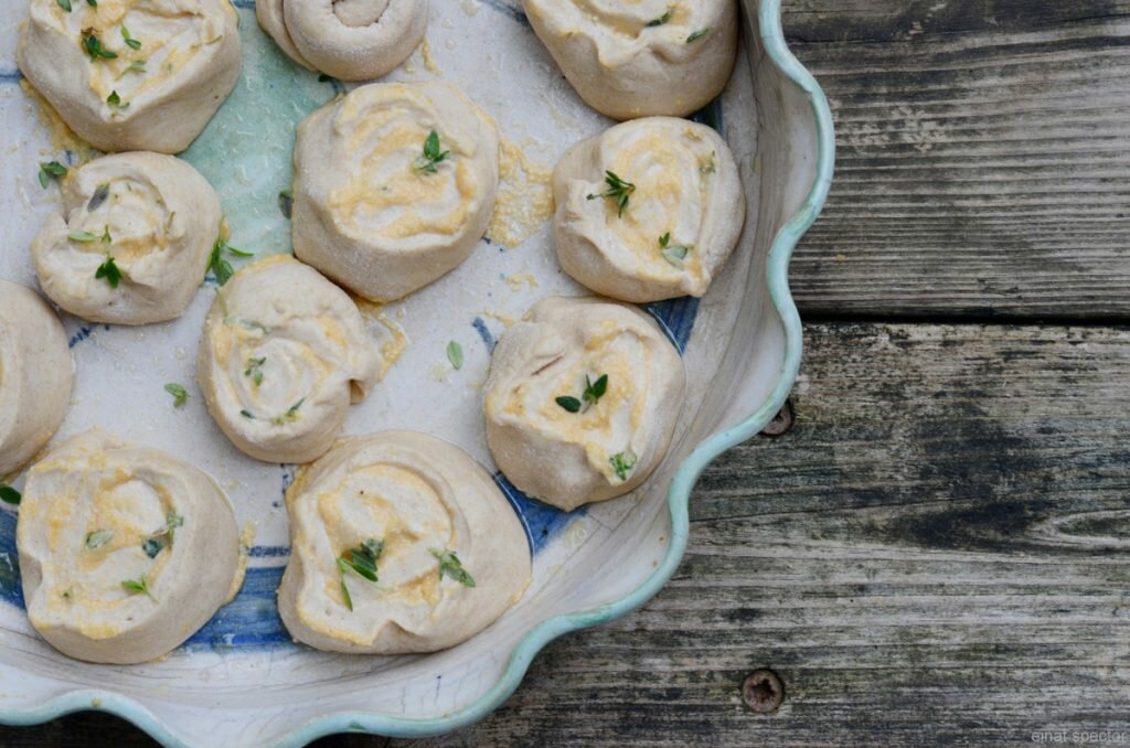♢ מגלגלים לגלילה ארוכה. פורסים לשבלולים בעובי 2-3 ס"מ ומעבירים לתבנית אפיה משומנת או לתבנית מרופדת בנייר אפייה.